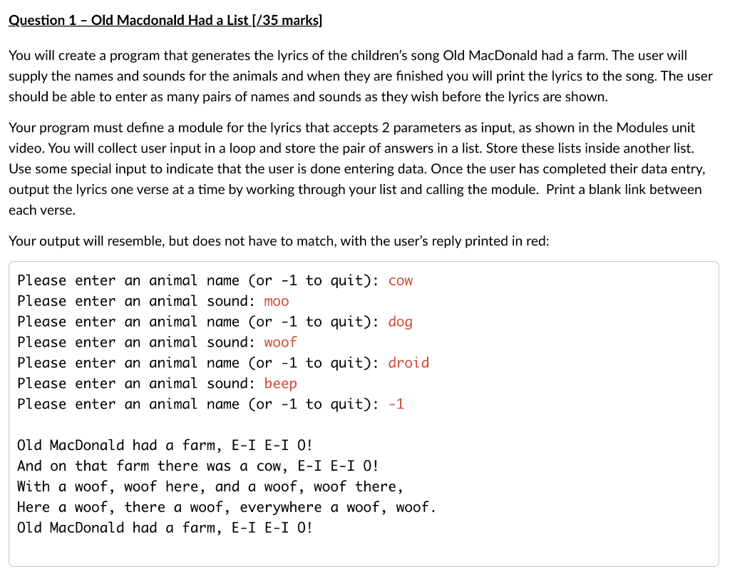 Solved Question 1 Old Macdonald Had A List 35 Marks You Chegg Com